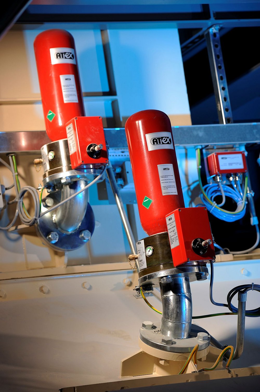 Die ATEX Explosionsschutz GmbH bietet für diesen Anwendungsbereich maßgeschneiderte Lösungen, die auf reale Prozessbedingungen abgestimmt sind. Das Unternehmen zählt weltweit zu den führenden Herstellern von tertiären Explosionsschutzkomponenten und entwickelt seine Produkte gezielt für Anlagen, in denen brennbare staubförmige Medien gelagert, transportiert und verarbeitet werden. Im vorbeugenden Explosionsschutz kommen Systeme zur CO-Detektion und Funkendetektion zum Einsatz, die frühe Anzeichen einer ungewollten Zündung oder eines Schwelbrandes erkennen. Ergänzt wird dies durch Systeme zur Explosionsunterdrückung, bei denen Drucksensoren den beginnenden Explosionsverlauf detektieren und innerhalb kürzester Zeit Löschmittel über ein Düsensystem in den betroffenen Anlagenteil einbringen. Steuerzentrale und Löschmittelflaschen sind dabei so ausgelegt, dass sie auch unter rauen Industriebedingungen zuverlässig funktionieren.