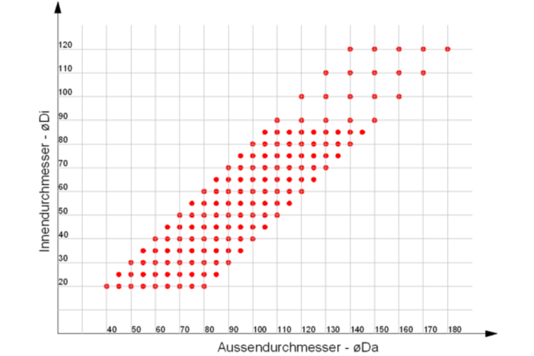 Jeder rote Punkt steht für eine realisierbare Kombination aus Aussen- und Innendurchmesser, die in unserem Sortiment verfügbar ist. Liegt eine gewünschte Masspaarung auf einem roten Punkt, ist sie sofort verfügbar.