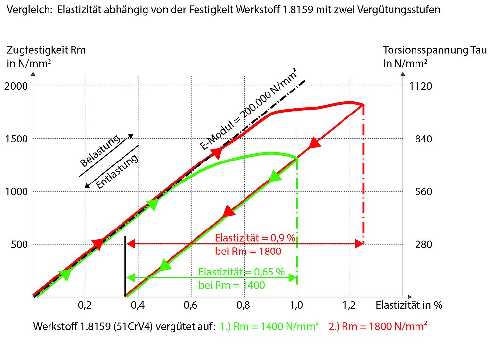 Die Federsteifigkeit ändert sich nicht mit der Festigkeit des Werkstoffes. Stattdessen beeinflusst die Festigkeit des Werkstoffs den maximal möglichen Federweg positiv. Die Festigkeit des Werkstoffs hängt von dessen Vergütungsstufe ab (siehe Abbildung). Die Vergütung beschreibt die kombinierte Wärmebehandlung von Metallen, bestehend aus Härten und Anlassen. Sie beeinflusst somit die Elastizität, aber nicht den Elastizitätsmodul, da dieser werkstoffspezifisch festgelegt ist. Ein niedriger Elastizitätsmodul ermöglicht eine größere Durchfederung bis zur vorgegebenen Grenze, was bedeutet, dass über einen größeren Federweg mehr Energie verfügbar ist (siehe Abbildung). Dies bedeutet, dass ein Werkstoff mit niedrigerem Elastizitätsmodul einen größeren Federweg bietet, was wiederum mehr Energie speichern kann. Ein Beispiel hierfür ist Titan, das trotz seiner geringeren Festigkeit aufgrund seines niedrigeren Elastizitätsmoduls genauso viel Energie speichern kann wie hochfester Stahl.