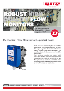 Az Eletta D-sorozata egy digitális kijelzővel rendelkező kivitel, mely elektronikusan 90 fokos lépésekben 360 fokos szögben elforgatható. A pillanatnyi áramlásértéken kívül a nullázható összegzett áramlásérték is kijelzésre kerül. Az áramlásőrben két relé kapcsoló van, amelyek a mérési tartományon belül egymástól függetlenül állíthatóak. Ezt a funkciót használhatjuk magas és/vagy alacsony áramlási riasztások beállítására. A műszer 4-20 mA-es, HART, impulzus- vagy frekvenciakimenettel rendelkezik. Egy szimulációs mód segítségével üzembe helyezés előtt „szárazon” választhatjuk ki a kívánt beállításokat.