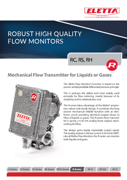 Az Eletta R-sorozata egy helyi kijelző nélküli áramlásmérő, mely 4…20 mA-es jelkimenet segítségével lineárisan továbbítja az áramlás sebességét a vezérlés felé, folyadékok és gázok esetén is egyaránt. A kialakítás nagy ismétlési pontosságú kimeneti jelet biztosít. Az R-sorozatnak 3 különböző változata van: RH, RS és R5C