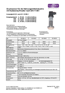 | SD-140 | Frontmembrános | Rozsdamentes acél | Hollanderes csatlakozás DIN 11851 szerint DN25-DN50 | 0,5% | Standard: 4…20 mA Opciók: 0…5 V, 0…10 V | 0..+1 ... 0..+40 bar, -1..0 ... -1..+24 bar, 0..+100 ... 0..+600 mbar | Gázok és folyadékok |