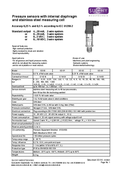 | SD-33 | Belső membrános | Rozsdamentes acél | G1/4" külső menet | 0,25% | Standard: 4…20 mA Opciók: 0…20 mA, 0…5 V, 0…10 V | 0..+1 ... 0..+1000 bar, -1..0 ... -1..+24 bar, -100..0 ... 0..+600 mbar | Gázok és folyadékok |