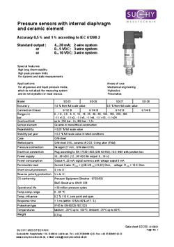 | SD-28 | Belső membrános | Kerámia | G1/4" külső menet | 0,5% | Standard: 4…20 mA Opciók: 0…20 mA, 0…5 V, 0…10 V | 0..+1,6 ... 0..+400 bar, -1..+1,5 ... -1..+24 bar | Gázok és folyadékok |